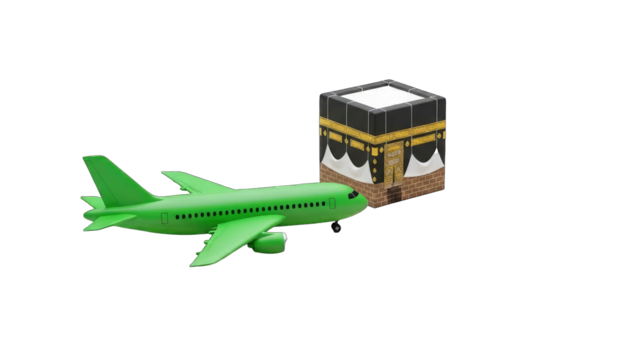 Green Airplane Flying to Kaaba, Islamic Pilgrimage Concept