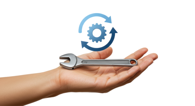 Black wrench and gear icon, symbolizing repair and maintenance, isolated on transparent background