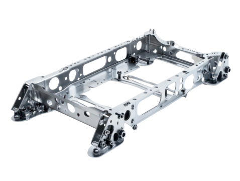 Mechanical cube framework constructed from metal rods and screws on a transparent background