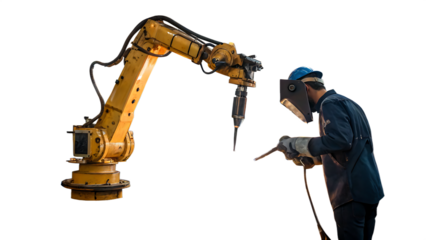 Industrial Welding Robot and Worker in Protective Gear Isolated on White Background as Transparent. PNG. AI GENERATED
