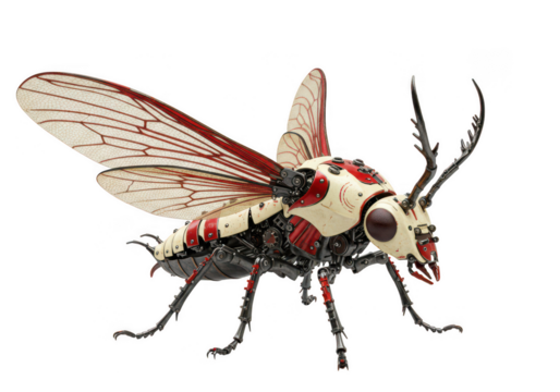 Intricate steampunk beetle with mechanical wings and red accents isolated on transparent background