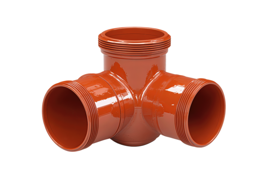 Industrial PVC pipe elbow in burnt orange with dual couplings and visible gasket ridges, smooth satin surface with slight scuff marks at edges, functional and precise, isolated on transparent backgrou