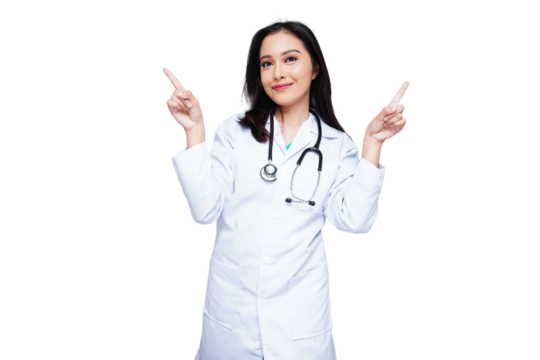 Beautiful medical student in white coat with stethoscope pointing upwards isolated transparent