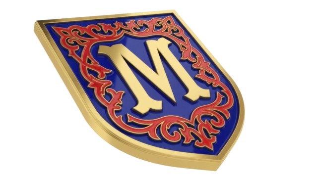 Isolated logo medallion displaying letter M, gold finish, royal blue and red enameled accents