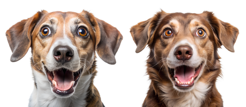 Close-up of the tilted muzzle of two dogs on a transparent background. The dog is colored in shades of white and brown. Studio shooting.