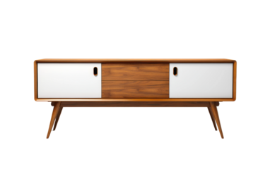 Modern wooden media console with drawers and shelves isolated on transparent background