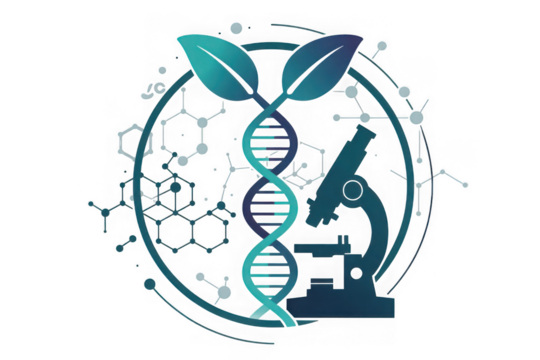 Futuristic dna helix with leaves microscope and molecular structures science technology
