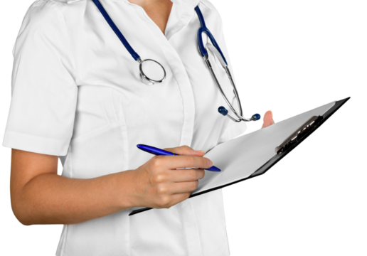 Closeup of Female Doctor , Nurse Writing on Clipboard