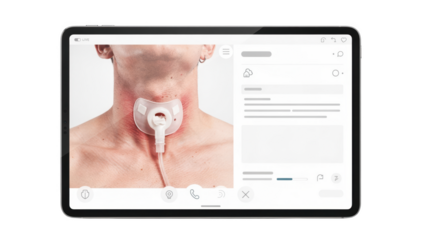 Splitscreen tablet interface featuring a live remote tracheostomy check with sidebyside views of patient stoma and medical notes on a clean white backdrop.