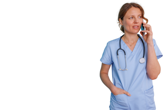 Female healthcare professional in blue scrubs using smartphone, communicating about medical care, transparent background
