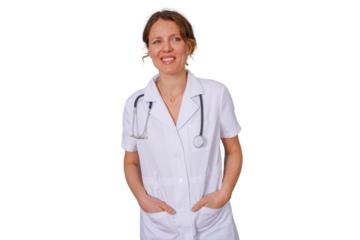 Healthcare professional smiling, standing, hands in pockets, representing medical care, wellness, and trust. Transparent background