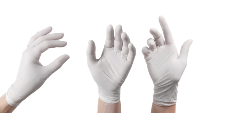 high-angle photograph showcasing three hands adorned with pristine white latex gloves, demonstrating hygiene and protection in a clear studio setting.