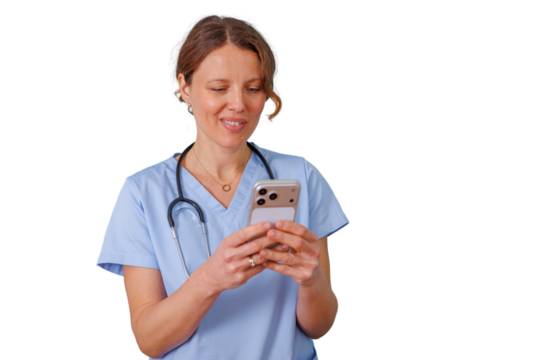 Healthcare professional using a smartphone for telehealth communication and medical app on transparent background