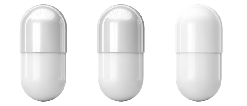 Three sleek, glossy white capsules arranged in a row against a plain background, showcasing their smooth surfaces and rounded edges, ideal for pharmaceutical or wellness-related content