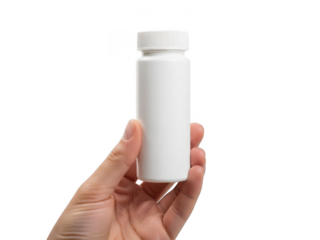 Amber glass bottle with white cap and blank label for medication or liquid isolated on transparent background