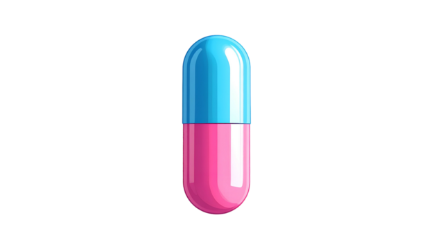 A stylized, brightly colored capsule medication with a blue top and pink bottom against black