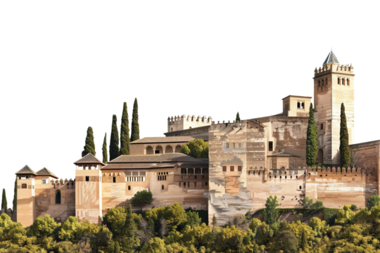 Majestic stone castle isolated on transparent background, medieval architecture with towers and drawbridge for historical and fantasy themes