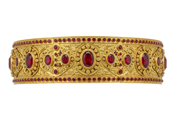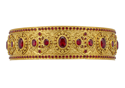 A detailed gold bracelet with ornate carvings  embedded oval and circular red gemstones against a black background