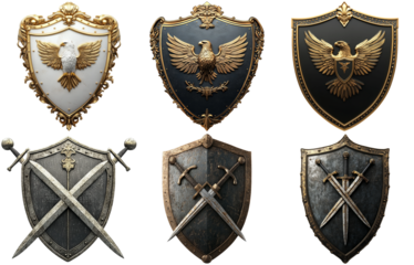 Collection of golden shield, defense protection shield isolated on a transparent background, cut out, PNG