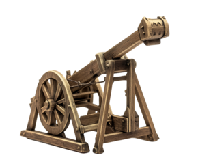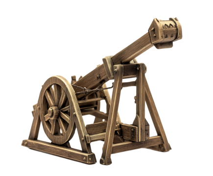 A wooden catapult model showcasing intricate craftsmanship and historical design. Isolated on transparent white background, png