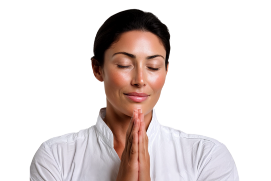 Calm woman meditating in transparent background with closed eyes