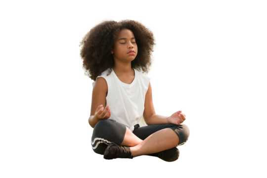 African American little girl doing meditate yoga asana with eyes closed on transparent background. Kids girl practicing doing yoga