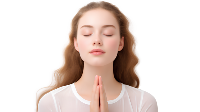 A relaxed teenage girl in a meditative pose, her eyes gently closed, gracefully isolated on a transparent background, Generative AI