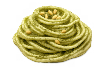 Pesto sauce swirl topped with pine nuts on transparency showcasing fresh italian basil and olive oil flavor