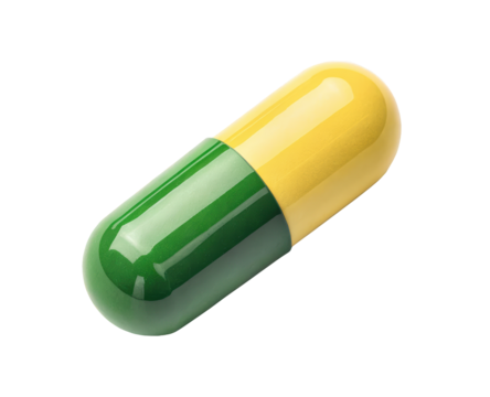 Green and yellow medical capsule pill isolated on clean transparent background in PNG, ideal for pharmaceutical ads, healthcare packaging, supplement branding, and medication-related visuals