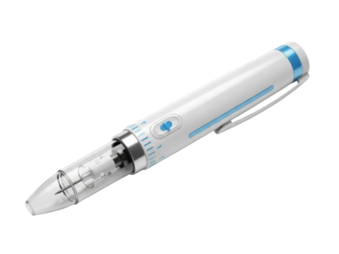 High resolution PNG image of a medical injection pen used for Ozempic treatment, isolated on a transparent background for design use.