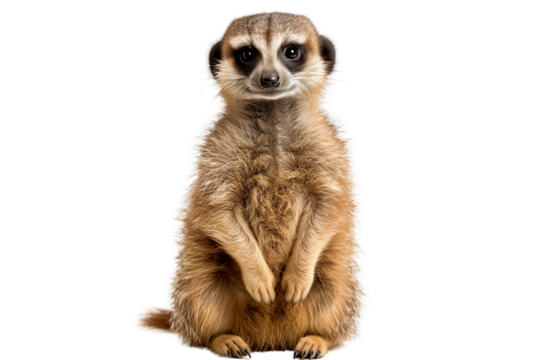 A meerkat standing upright, isolate on white background, showcasing its curious nature and alert posture. PNG