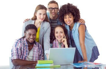 Two business people working together with laptops on table and looking happy isolated on white or transparent background