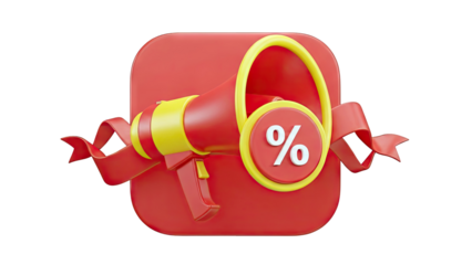 3D Megaphone with Percentage Sign and Ribbon for Sales and Discounts