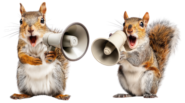 Funny squirrels shouting through megaphones isolated on white or transparent background – humor, protest and communication concept