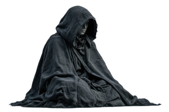 Cloaked figure sits, draped in fabric, in deep shadow