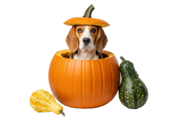 Beagle, brown and white fur, melancholic eyes, sits in vibrant orange pumpkin with lid as hat, flanked by decorative gourds, transparent background. pet-friendly halloween concept