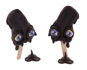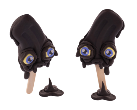 black melted ice cream isolated on white background. sculpt ice cream with eyes from plasticine