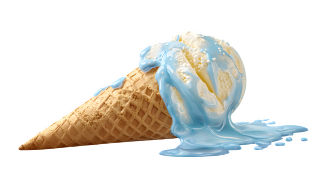 Earth as melting ice cream cone, climate change metaphor, waffle cone, isolated on a transparent background