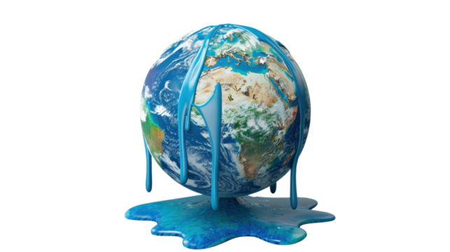 A melting globe representing climate change, showcasing the Earth with dripping ice and water.