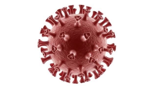 Viral particles with red spike proteins and blue membrane surface in microscopic detail isolated on a transparent background