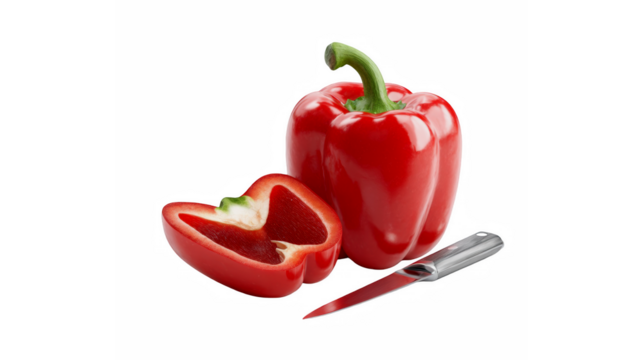 A vibrant red bell pepper, whole and halved, with a knife