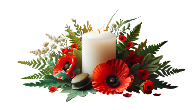 A lit white candle surrounded by delicate white flowers creates a serene and elegant centerpiece perfect for ceremonies transparent background