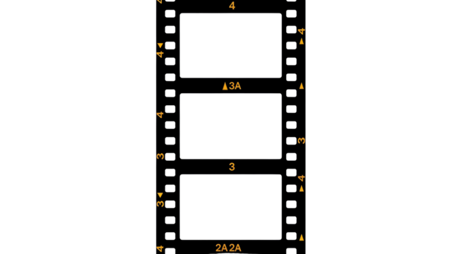 Film strip negative with sprocket holes and frames, representing vintage photography and cinema. Transparent PNG image.