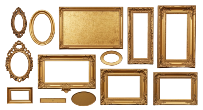 Golden Antique Frames: A collection of exquisite, gilded antique frames of various shapes and sizes, ready to adorn and showcase precious memories or artwork, adding a touch of elegance and history.