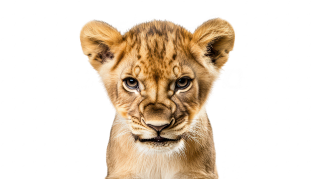 A close-up portrait of a young lion cub with intense eyes. its playful yet fierce expression against a plain white background. ideal for wildlife photography and educational use