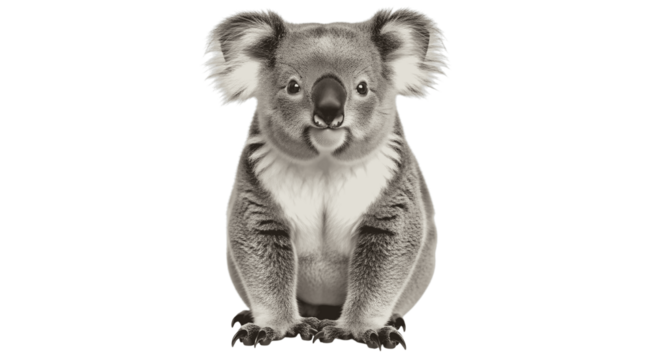 Adorable koala bear sitting upright looking forward with its tongue out isolated on transparent background