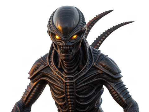 Menacing, darkly textured alien creature with a biomechanical exoskeleton and elongated skull, featuring glowing orange eyes and a menacing grin, stands in a, isolated on transparent background.