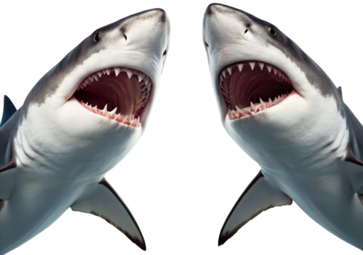 Powerful, menacing great white sharks with textured grey skin and sharp, jagged teeth are depicted in a dynamic upward-facing pose, mouths agape revealing pink, isolated on transparent background.