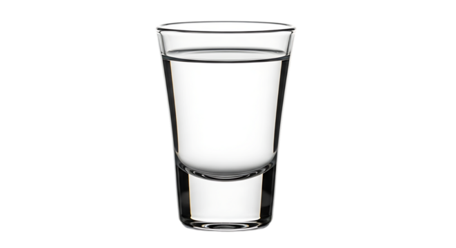Shot glass with clear liquid on isolated black background close up