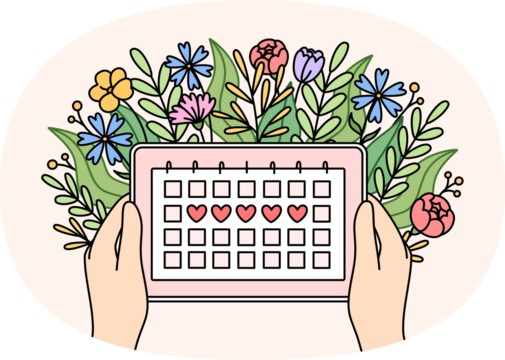 Menstrual cycle calendar in hands of woman and flowers, for design of gynecological products for girl or calculation of PMS. Women health concept and tracking menstrual or PMS days